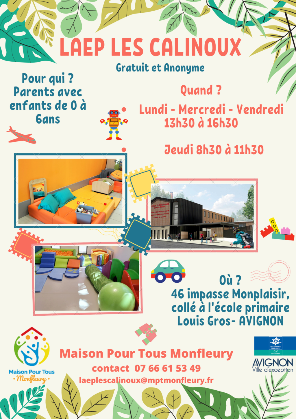 Le LAEP « les calinoux » géré par la MPT, fait partie du réseau des LAEP de la ville d’Avignon, vous accueille parent et enfant gratuitement et anonymement. Venez partager un moment avec votre enfant dans un lieu convivial où il pourra jouer avec d’autres enfants et se préparer à la vie en collectivité. Un lieu pour les parents aussi, pour prendre un temps pour se poser, discuter, rencontrer d’autres parents et des professionnels à votre écoute..